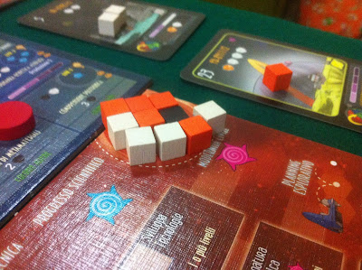 Sistemiamo le plance giocatore suddivise in -azioni e -sviluppi tecnologici. Sul primo piazziamo il cubetto selettore di azioni nello spazio Terraformazione e nello spazio riserva personale sistemiamo 4 cubi energia (arancio), 4 materia (bianco) e 3 antimateria (nero). Sulla plancia sviluppi tecnologici sistemiamo cinque dischetti nazione negli spazi iniziali. Prendiamo ognuno la carta terra del proprio colore sopra la quale sistemiamo 3 cubi energia e 3 cubi materia. Peschiamo a caso una carta obiettivo (scegliamo tra quelle base per non mettere troppa carne al fuoco) e infine avanziamo due dei 5 indicatori nazione sulla plancia di sviluppo di uno step ciascuno. Inizio io… sento un vuoto, quello che rimbomba nello spazio celeste: “che fare? TAAAANTA ROBAAAA!”.